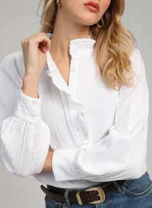 Le volant qui borde le col et la patte de boutonnage apporte une touche élégante et subtilement romantique. Avec ses manches longues légèrement bouffantes et sa coupe fluide, cette chemise s’associe facilement avec un jean ou un pantalon pour une silhouette lumineuse et raffinée.