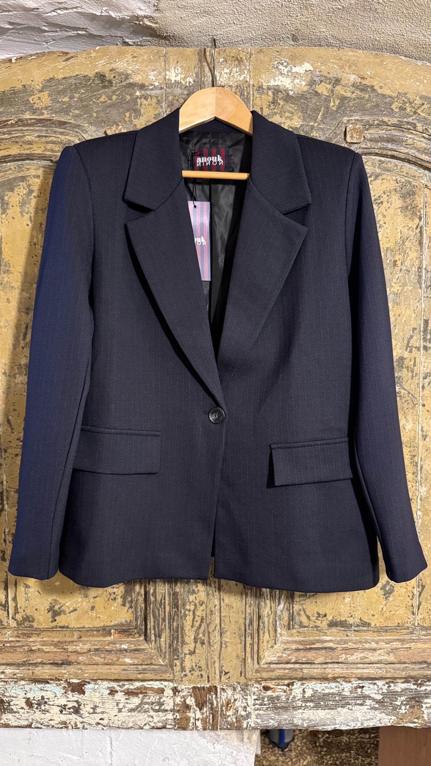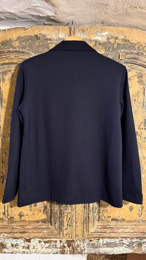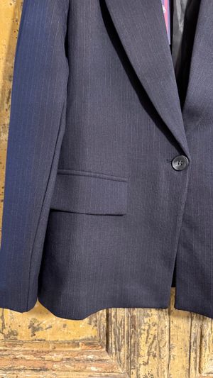Adoptez un look chic et structuré avec ce superbe blazer marine à fines rayures, une pièce incontournable pour composer des tenues élégantes et modernes. Sa coupe précise et son unique bouton en font un indispensable du vestiaire féminin, aussi bien pour le bureau que pour un style quotidien soigné.