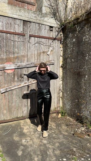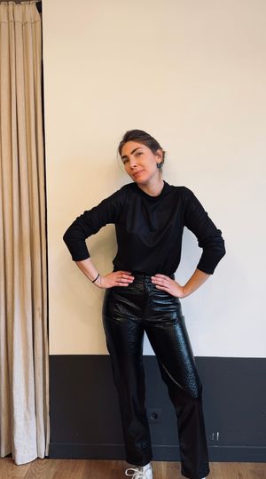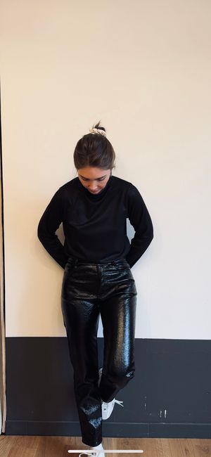 Apportez une touche originale à votre garde-robe avec Lombardie, le pantalon noir en vinyle, au style chic et urbain. À porter avec le top Mathilde pour un total look black, 100% made in France.