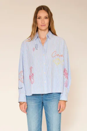 Sur une base de rayures bleues intemporelles, viennent se poser des broderies colorées inspirées de l’univers marin. Résultat : une pièce originale mais facile à porter.