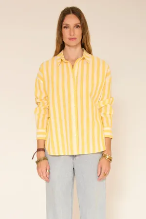 Une chemise qui respire l’été. Ses rayures jaunes soleil et blanches illuminent la silhouette et apportent instantanément de la fraîcheur. Sa coupe droite, légèrement ample, offre un tombé naturel et structuré à la fois : ni trop loose, ni trop ajusté.