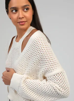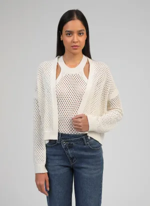Ce gilet en maille ajourée écru est une pièce légère et élégante qui apporte une touche de douceur à toutes les tenues. Sa maille délicatement perforée crée un jeu de transparence subtil, idéal pour la mi-saison ou les soirées d’été.