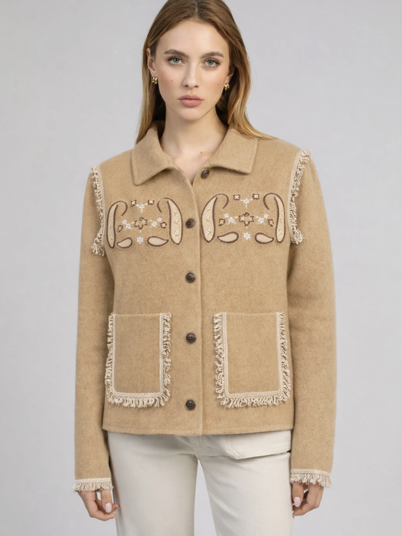Ce gilet en maille jacquard est une pièce forte qui apporte immédiatement du caractère et de l’élégance à une tenue. Son motif bandana, subtilement travaillé, associé aux franges décoratives, lui donne un style à la fois glamour, féminin et affirmé.