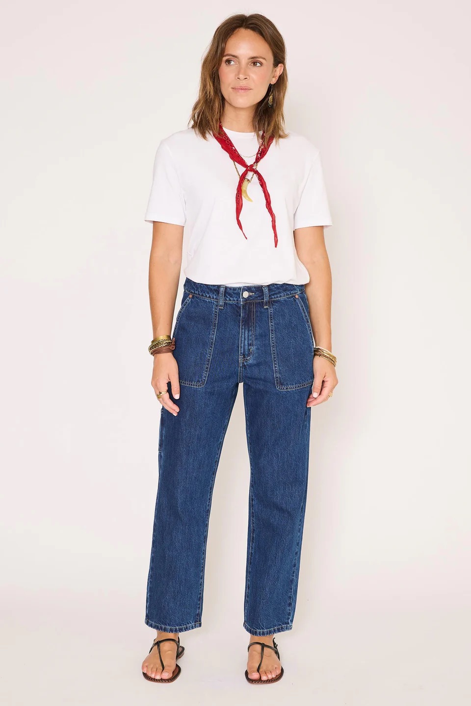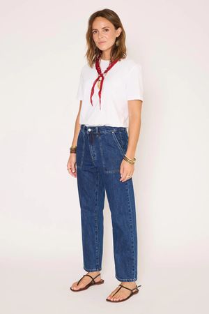 Ce jean en denim bleu revisite le jean classique avec une inspiration worker moderne. Sa coupe droite légèrement ample offre une silhouette confortable et actuelle, idéale pour un look casual du quotidien.