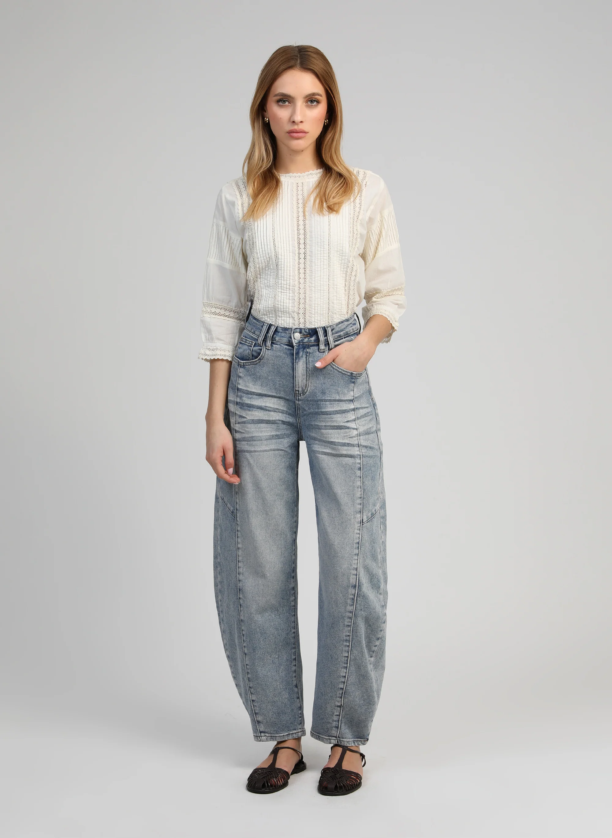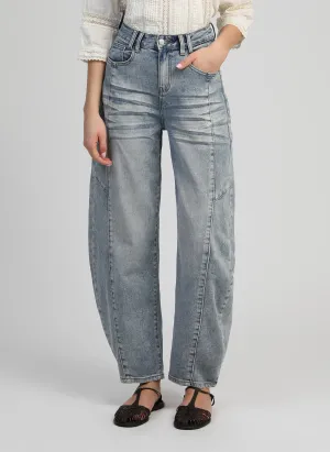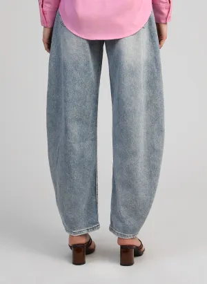 Le jean Barrel revisite le denim avec une silhouette moderne et structurée. Sa coupe légèrement arrondie sur la jambe crée un volume élégant qui affine la taille et apporte une allure contemporaine.