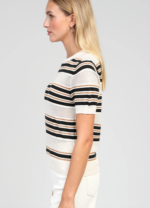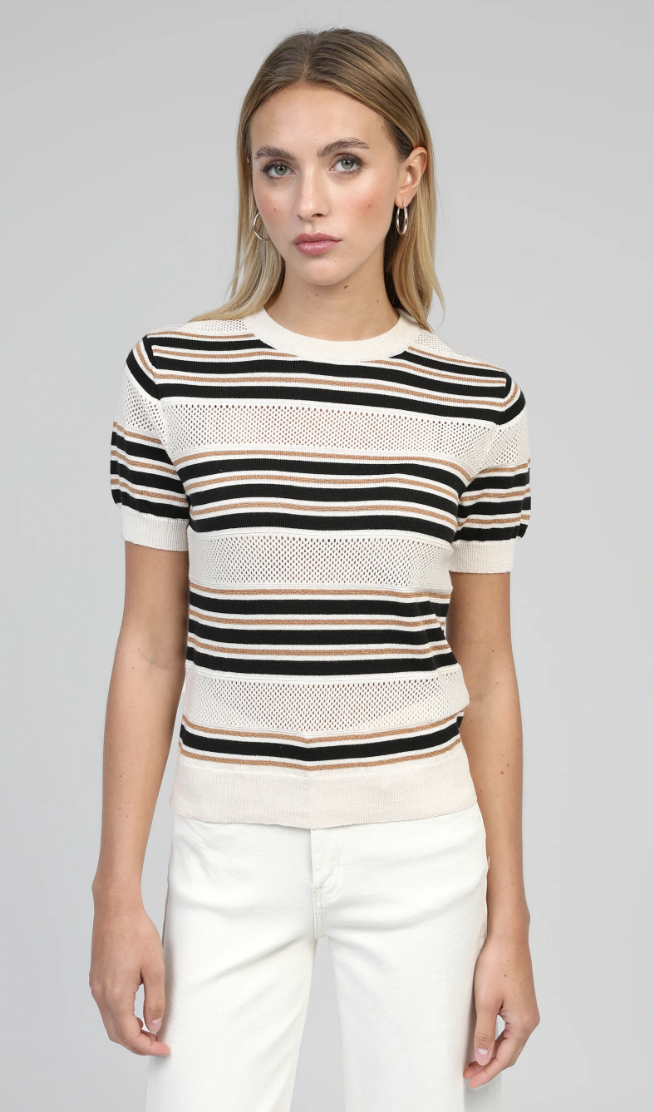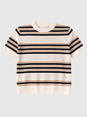 Confectionné dans une maille douce et respirante, ce t-shirt offre un confort optimal tout au long de la journée. Son jeu de rayures fines noir, camel et écru apporte du relief et de la modernité, tandis que sa coupe droite flatte la silhouette sans la contraindre.