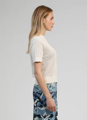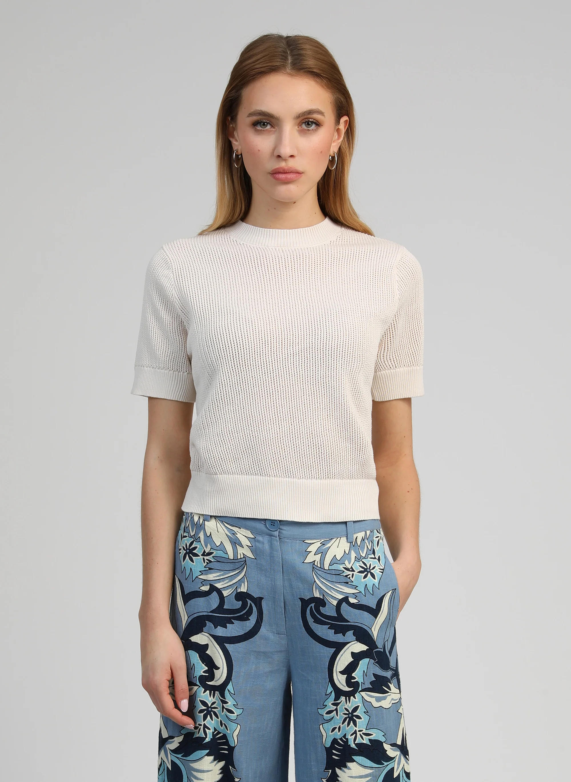 Ce tee-shirt col rond, en maille écru est un essentiel du dressing féminin, à la fois élégant et facile à porter. Sa maille fine et texturée apporte une touche raffinée tout en offrant confort et légèreté au quotidien.