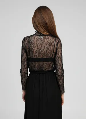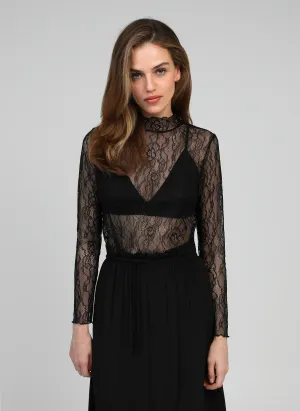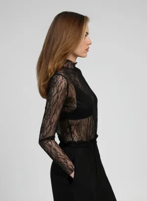 Ce haut en dentelle noire transparente incarne l’élégance et la féminité. Sa dentelle délicate dessine un motif raffiné qui sublime la silhouette tout en apportant une touche sensuelle et sophistiquée.