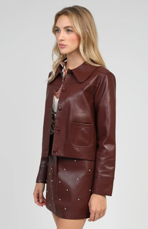 Confectionnée dans un similicuir souple au bel aspect lisse, elle offre un tombé net et confortable. Le col chemise, la fermeture boutonnée sur le devant et les poches plaquées apportent une allure soignée et intemporelle. Disponible en noir, classique et indémodable, ou en lie de vin, plus original et sophistiqué, cette veste s’adapte à tous les styles.